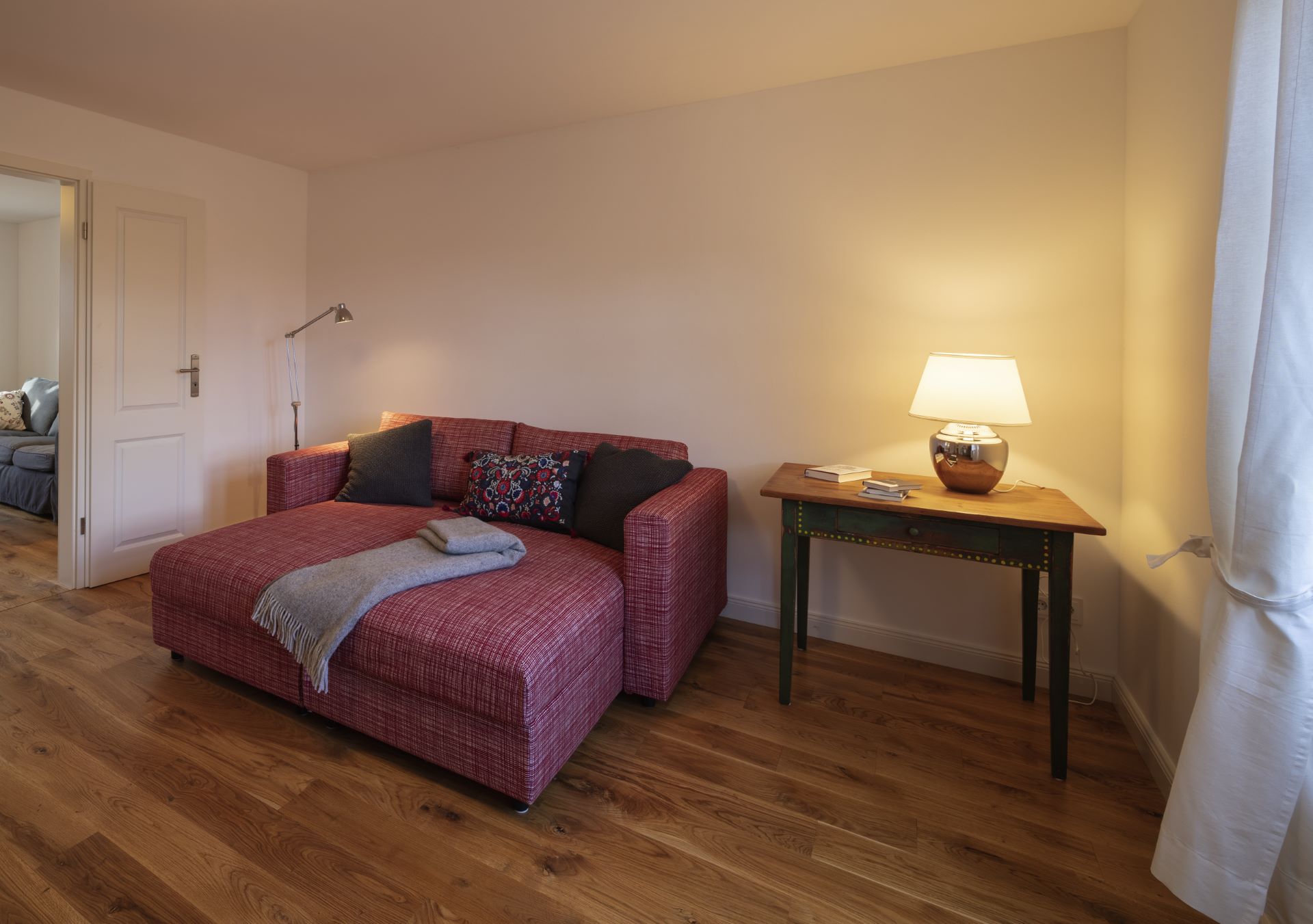 145 qm Wohnfläche erstrecken sich über zwei Etagen. Die beiden, ineinander übergehenden Wohnzimmer im Erdgeschoss bestechen mit viel Licht und einem wunderbaren Ausblick auf die Weiden.